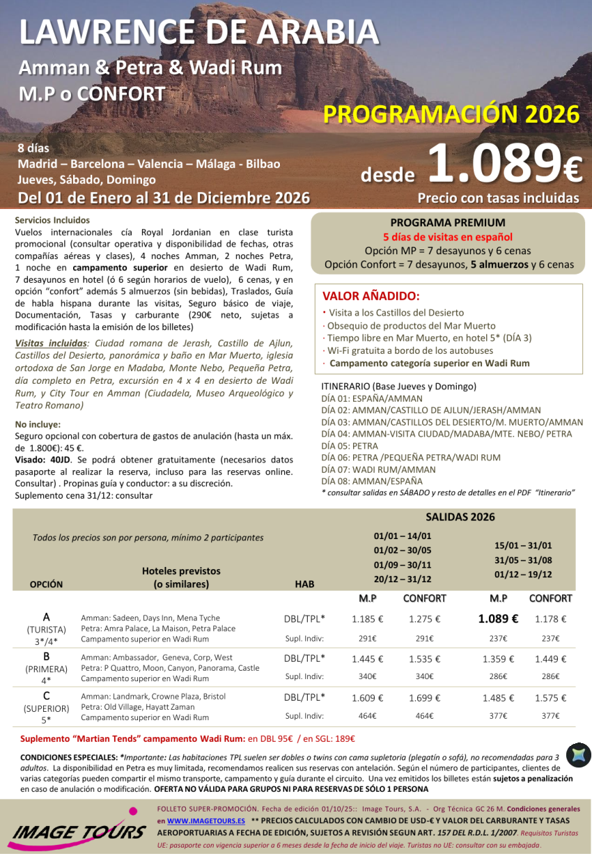 JORDANIA *Circuito 8 días Premium* Lawrence de Arabia, con campamento superior en Wadi Rum, desde 1.089€